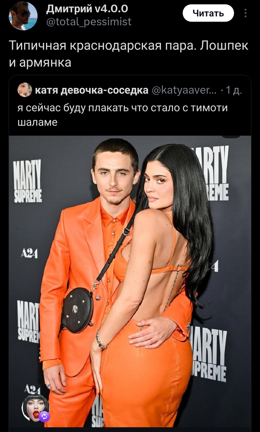 Как этот скуфидзе даже без бровей жонглирует двумя тёлками? Оправдывайтесь инцелы. Вообще, все эти чеды наблюдются только в инцел тредах и инстаграме. Достаточно выйти в реальную жизнь, или хотя бы женские паблики полистать - и там вот такое. Но если это признать, то придётся признать что проблема не во внешности.