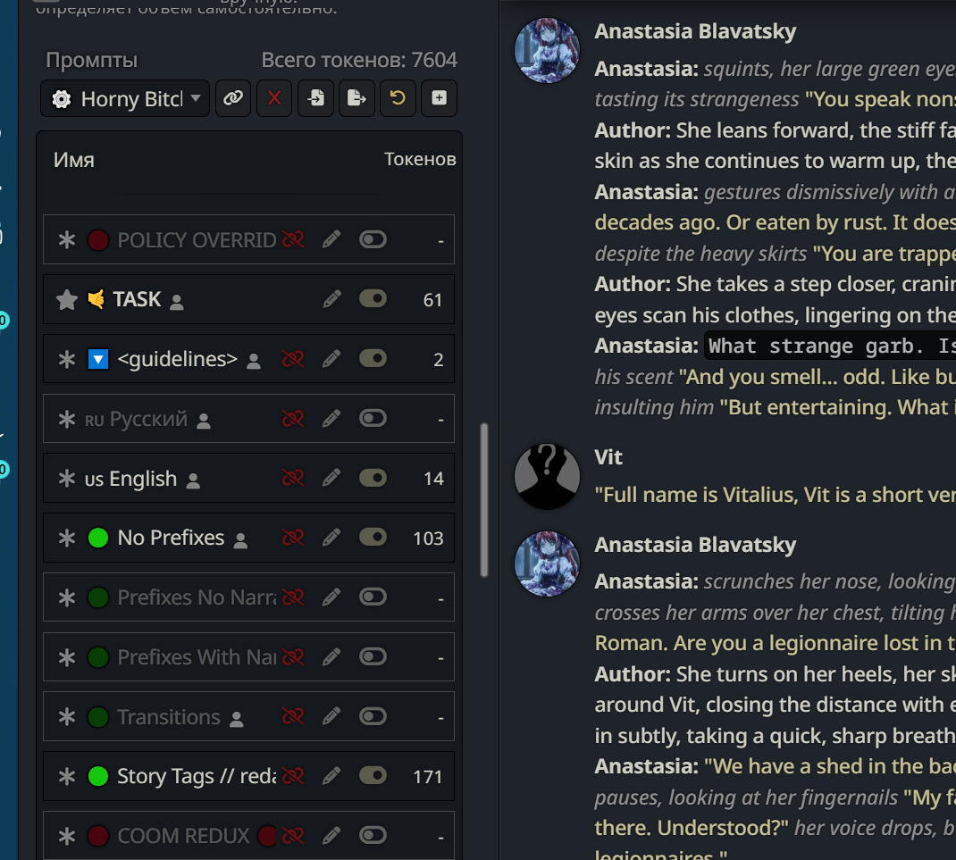 Что нового: 🚬 Добавлены регексы на думалку и всякие html (устанавливаются автоматически вместе с пресетом, при возникновении ошибок можно дозагрузить с сайта) Если коротко, то регексы будут удалять из контекста (все, что вы отправляете на сервер ии) всякий мусор из предыдущих ответов типа инфоблоков, думалки и тд. Расход токенов значительно уменьшается, качество рп возрастает, а деньги экономятся — все в плюсе 😡 Удалена большая часть жанров и фетишей. Теперь нужно будет вписывать их в ручную (скорпировать с сайта и вставить в соответсвующие поля). База из коментариев, картинок и инфоблоков осталась нетронутой, но фетиши и жанры все равно очень индивидуальны, сильно перегружали пресет и влияли на цензуру. Придется чуть чуть поработать ручками