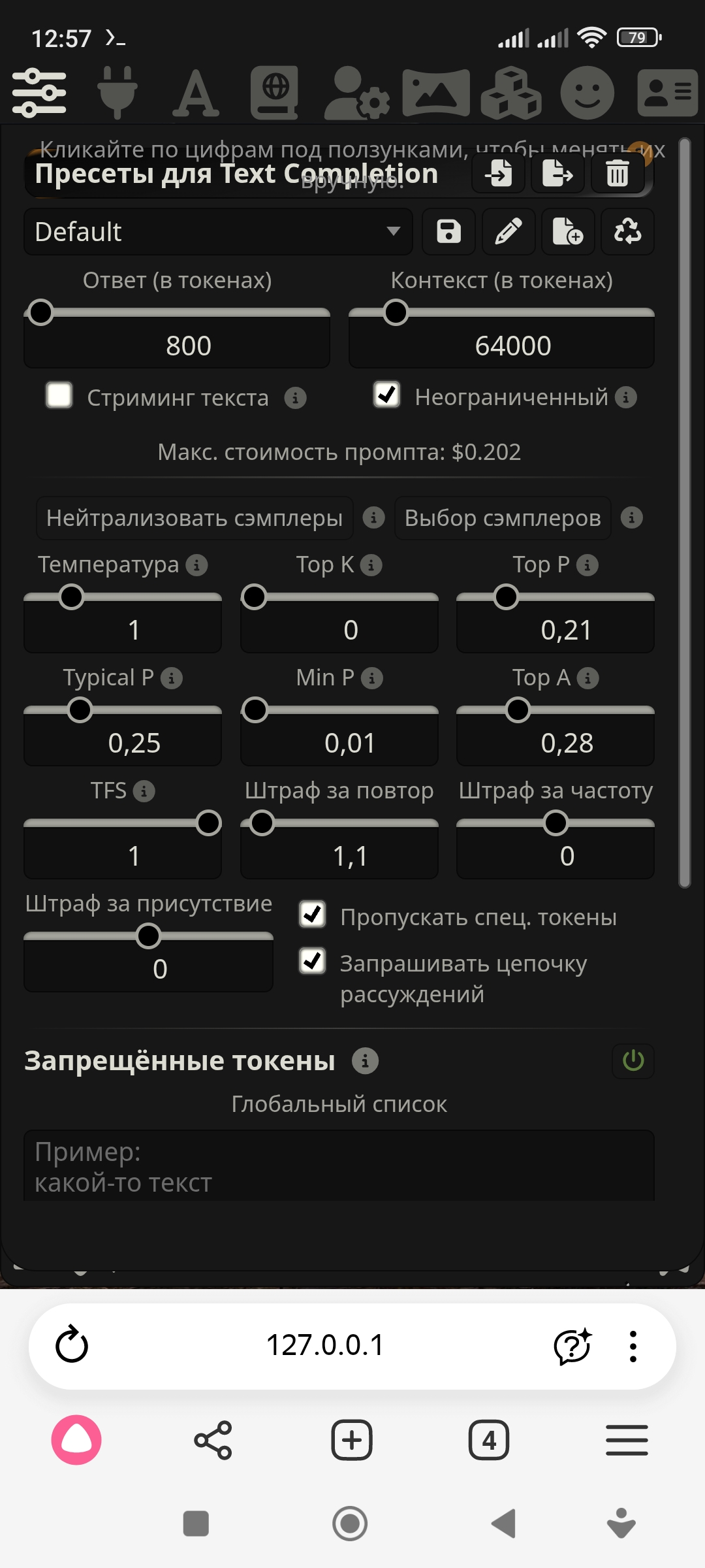 >>1449283 Выключаю все, кроме синкинга (переписываю его на самописный под себя), баннед вордс, пробелов и префилла. В синкинг промчу и подкрепляю стиль описаний и речи, и прочее по нужде.