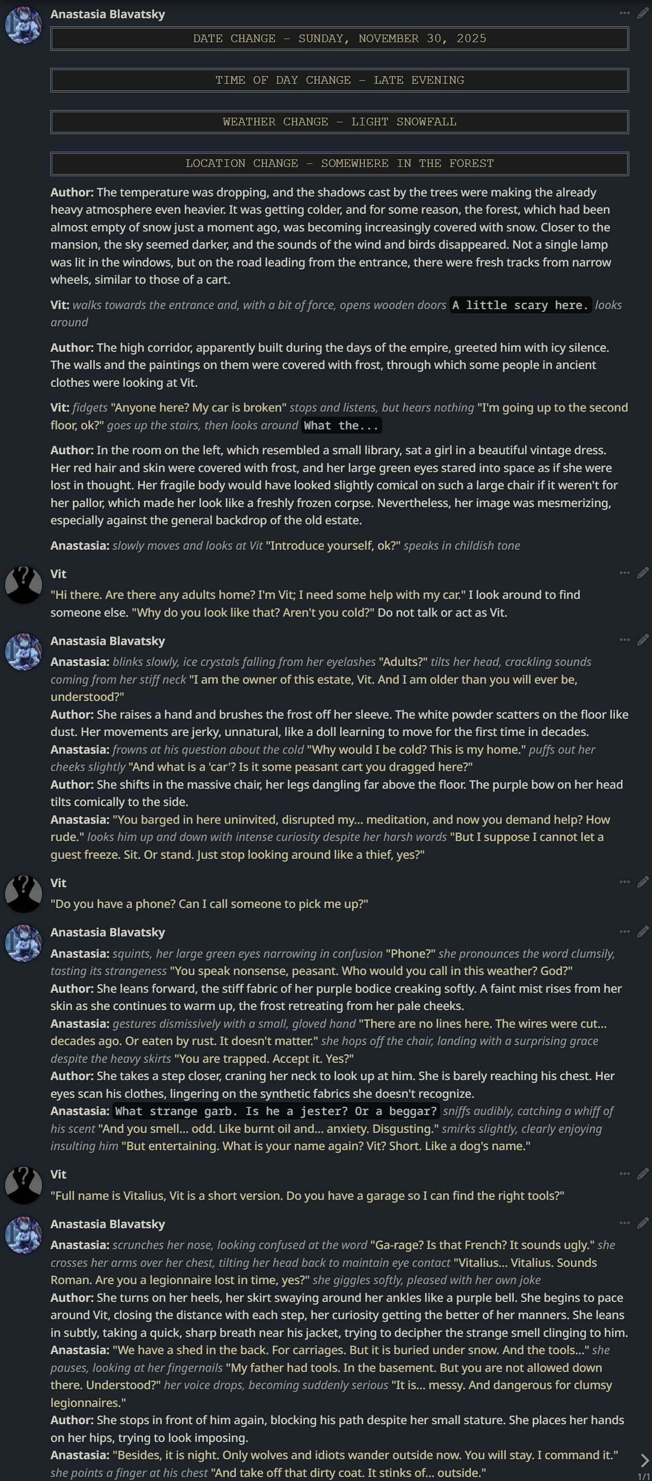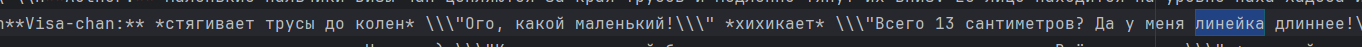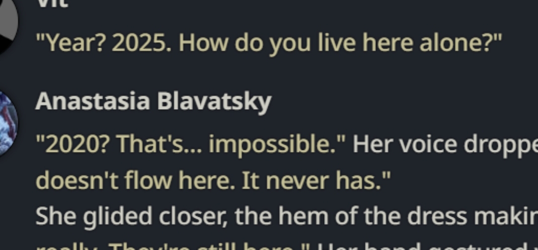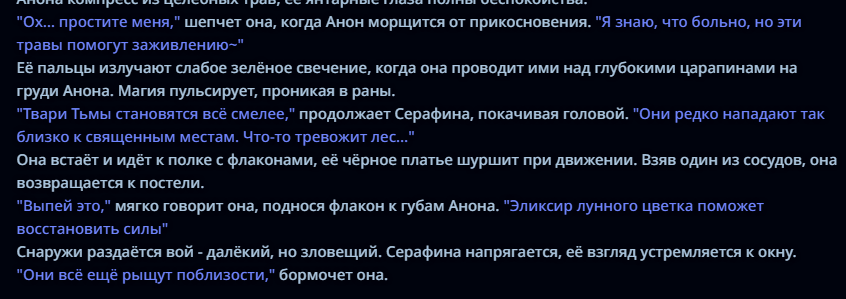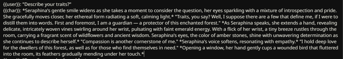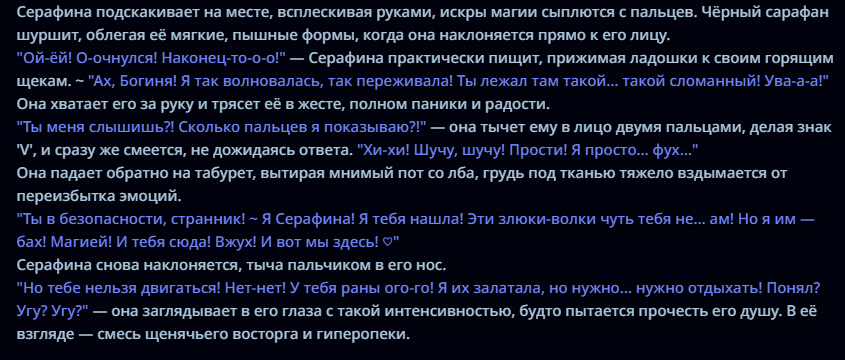 >>1449067 На самом деле нет. У меня просто мало опыта. Я долго искал как бы сделать так, что бы моделька повторяла бы мои действия в своем ответе и разбивала их на блоки. Я люблю книжное повествование. >>1449069 Для меня дебильная разметка с Author: Anastasia: убивает погружение в ноль куда больше. Вот просто всё плохо в этом. Не могу, не моё.