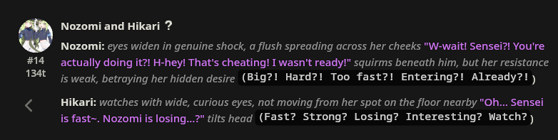 >>1448706 я отчасти полечил себе стиль письма + само повествование тегами в пресетах (у ремиксера тоггл такой есть и у пары пресетов из чатов тоже видел, с остальными не ебу). можно отсюда брать - https://rarestmeow.neocities.org/writing_style, можно просто к нейронке ходить и описывать чо надо + сеттинг/сюжет. судя по финкингу, нейронка оч любит за них цепляться при составлении ответов и забирает себе часть, по которым ориентируется при написании. из минусов под каждый сеттинг или бот лучше отдельно прописывать