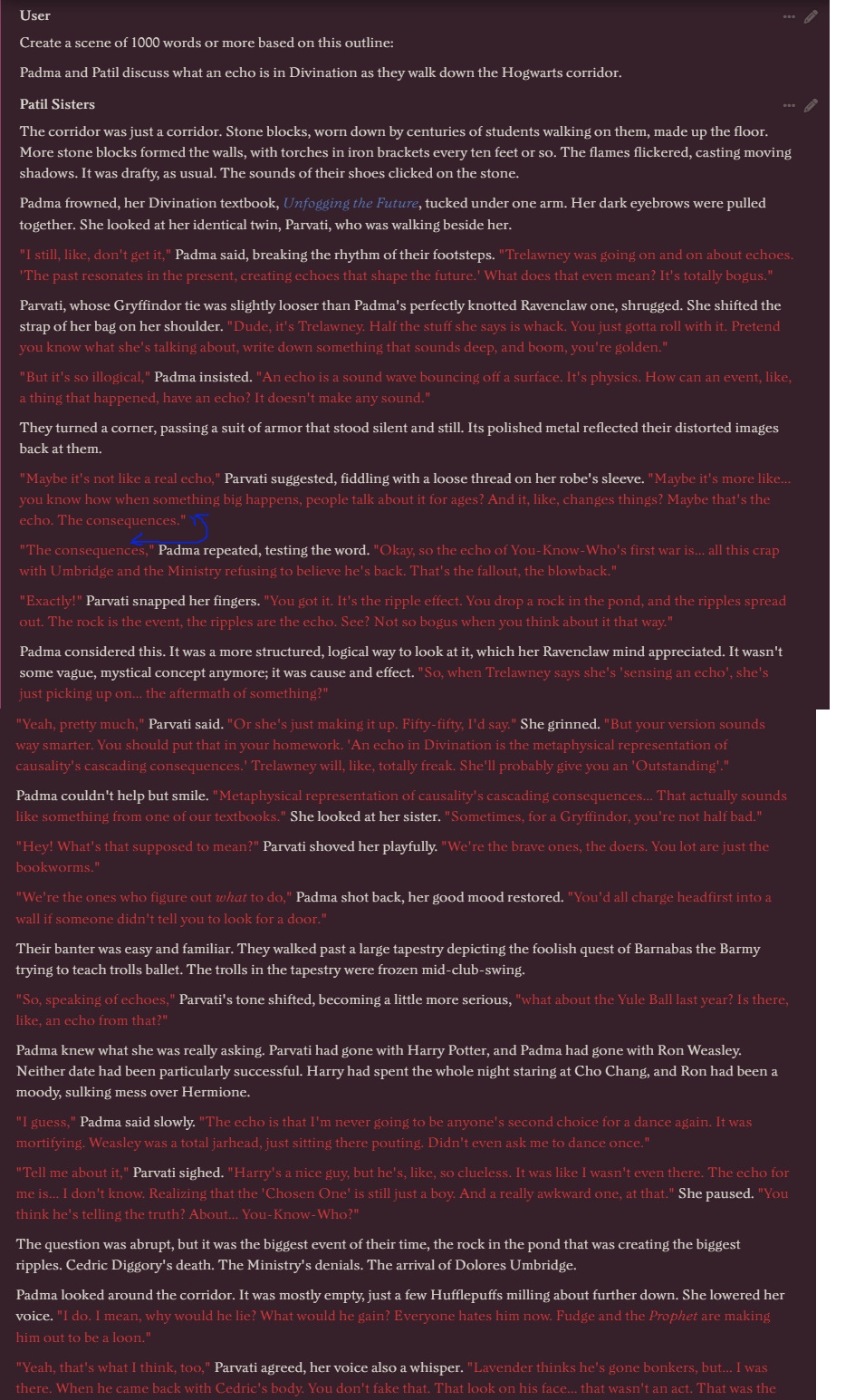 К этому осознанию и гвоздю нейроимпотенции я пришел благодаря тому, что сетка генерила мне 6 месяцев спустя что было с героями, и каждый раз у них была какая то другая жизнь, другая работа, повседневность