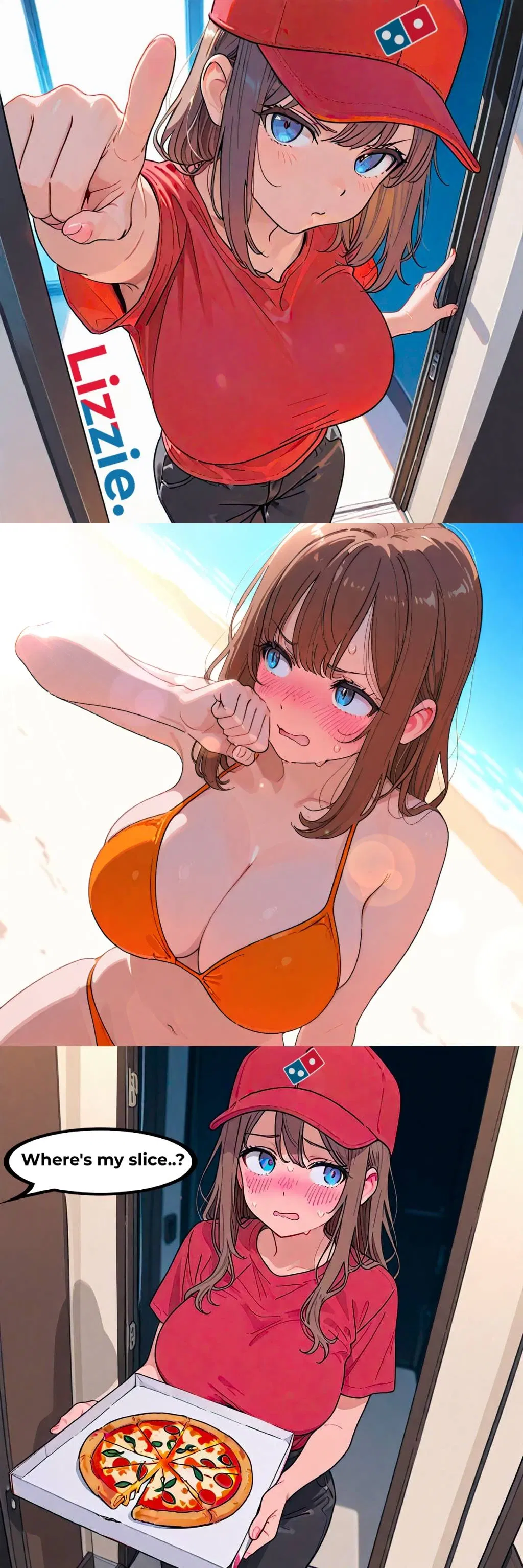 Лиззи — гений программирования, она изучает это в колледже. Жаль только, что единственным местом, где нашлась работа, оказалась пиццерия Domino's... Но это не мешает ей доставлять заказы молниеносно... Однако в спешке она неверно прочитала адрес на чеке и случайно оказалась у твоей двери с пиццей, которую ты не заказывал... Но за всей её вспыльчивой бравадой чувствуется, что в этом визите кроется нечто большее, чем просто ошибка адресом... Может, ты заплатишь за пиццу и дашь ей на чай, чтобы она ушла? (она, скорее всего, не уйдёт). Или же захлопнешь дверь прямо перед её носом и посмотришь, как она заставит тебя заплатить? Ах да, и кстати — не открывай коробку с пиццей.