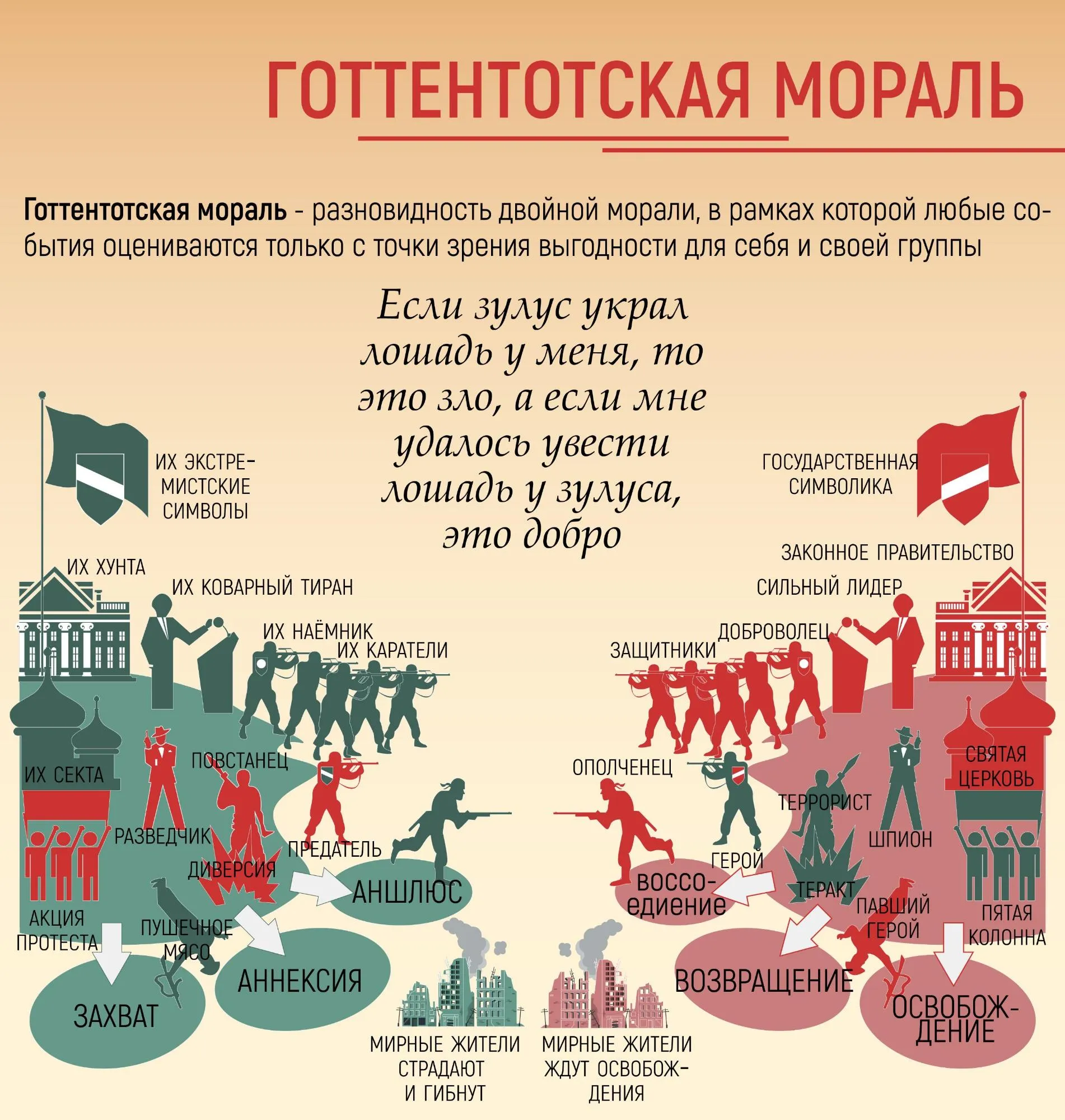 У нас кусок страны хочет отделиться - сепаратизм, вводим войска, делаем КТО. У НИХ кусок страны хочет отделиться - ОНИ вводят войска, делают КТО но это НЕПРАВИЛЬНО.