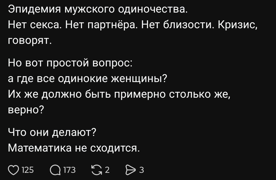 >>61414760 Есть такая вещь, как демография. 35-летних женщин физически больше, чем мужчин того же возраста. Значит, какой-то немаленький процент из них будет жить без мужчины. Лайки, инстаграмные подлизы и пара ночей со случайными Васьками не сделают их менее одинокими