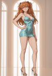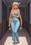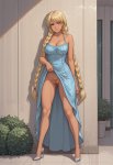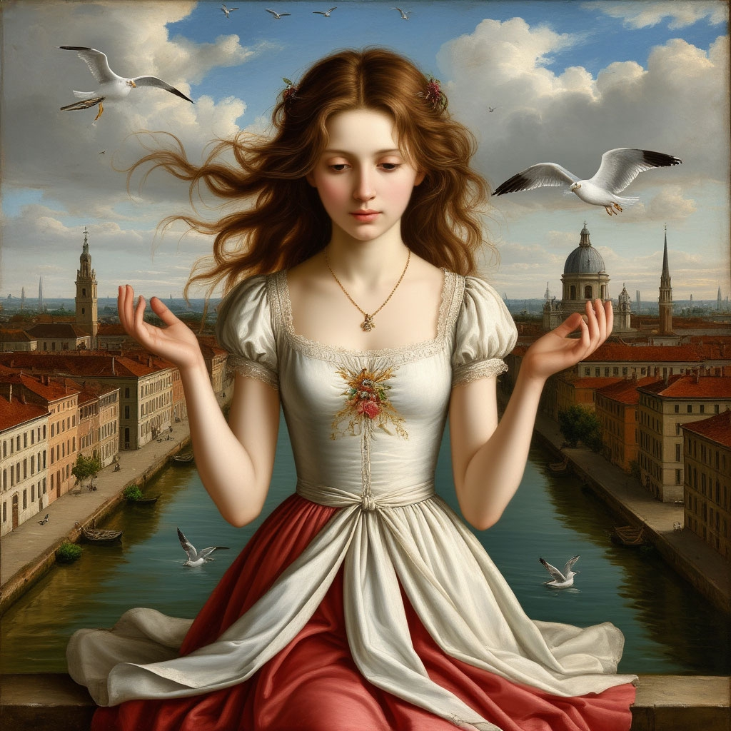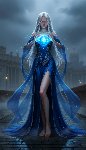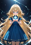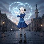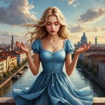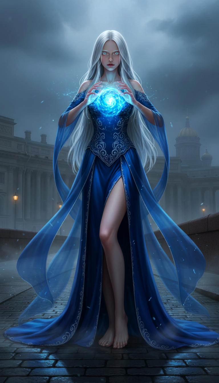 >>327714516 Young girl standing in full growth in blue dress creates magic between her hands. Her hair, her eyelashes are blonde, almost white. Behind her city, that remind Saint-Petersburg in early 20th century.