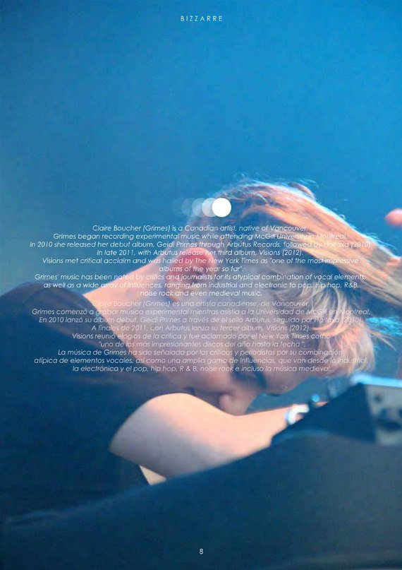 Клер Элис Буше, более известная как Grimes (Граймс) — канадская певица, музыкант, сонграйтер и клипмэйкер. Родилась и выросла в Ванкуверфе, увлеклась андеграундной музыкальной сценой и стала записывать собственную экспериментальную музыку под псевдонимом Grimes, параллельно изучая нейробиологию в монреальском Университете Макгилла.