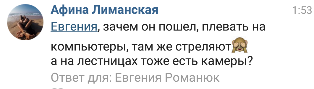 >>6595011 Не понял на счёт внутреннего двора и того, как он поднялся снова и убил Моисеенко. Она чё то попутала, видимо, так как он спустился на 1 этаж только после того, как застрелил его. Или, если вспомнить ту камеру возле боковой лестницы, которую заснял Ярик, то может он по ней предварительно ещё спускался? Путаница какая-то. Если он стрелял на первом этаже этого корпуса по, якобы, ещё одному двору, то как Моисеенко это мог не заметить на 2 этаже и не запереться в своем бронированном кабинете?