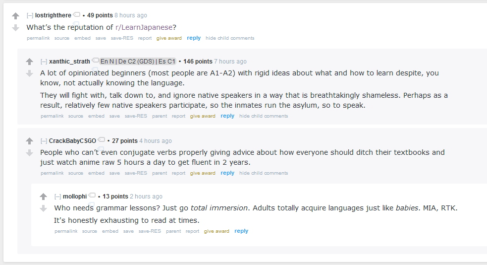 Обучение японскому по сути всегда это обучение первого языка с нуля русский учил в младенчестве бессознательно, а английский принудительно в школе классическим методом. Когда начинаешь с нуля, ты имеешь в распоряжении только имеющуюся информацию - классический школьный научный подход по учебникам. Других способов просто не было, узнать другие варианты неоткуда. Поэтому любой контентобог начинал с классиченсколго способа, но самостоятельно понял его непригодность и своим умом дошел чито контент лучше. И только тогда пришел на двач и начал об этом говорить, в результате чего нашлись и другие такие же. Так где тут "одно и то же" с адептами классики? Да нет ничего общего совершенно, наоборот противоположности ума и дебилизма. И вот этот ум совершенно не может жить на реддите, где господствует стадо, что и показывают скрины с количеством плюсов презирающих контент. Просто стадо, тупое стадо, плюсует свои догмы, и минусует отличное. Подавляется мышление, интеллект. Повторюсь, разница именно в том, что "мнение" дебилов это всегда популярное, авторитетное мнение, именно поэтому - дебильное по опреджелению, потому что бездумное. Потому что непопулярное мнение нельзя просто плюсовать, его нужно сначала осмыслить своим умом, и только потом делать вывод, плюсовать или нет, потому что непопулярное нельзя тупо бездумно принять на веру, вера так не работает, всегда нужен авторитет, либо толпа уже повторяющая такое, а у непопулярных мнений нет ни того, ни другого.