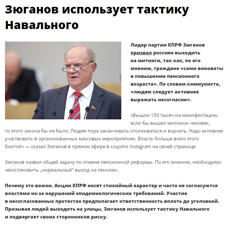 Не знаю, хватит ли у системных оппов смелости включить ответку. Скорее нет, чем да. Но не так давно тот же Зюганов заявлял "Людям пора заканчивать отсиживаться", говорил, что если бы на митинг против пенсионной реформы вышел миллион, никакой реформы бы не было.