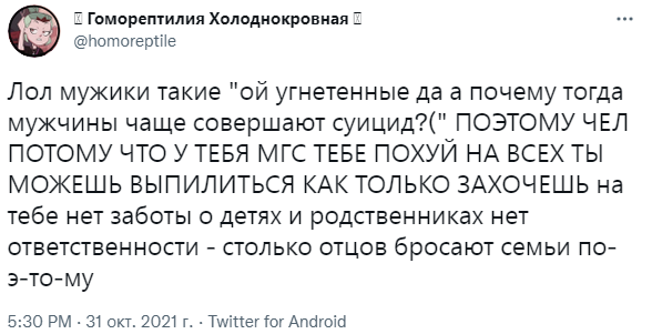 А как можно квалифицировать "суицид из-за ложных обвинений"? Тип каждый выпиливший оставляет записку или видос "Я name выпиливаюсь потому что меня ложно обвинили в изнасиловании" Насколько я осведомлен, мужики вообще в этом не запариваются, они просто идут и делают