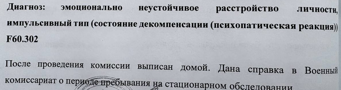 >>77487 Отвечает оп. Выше расписал с какого возраста и в каком году стою в ПНД. Врачебная комиссия была около минут 3. Тебя и человека 4-5 подводят к кабинету и по одному заводят. В кабинете сидит главная заведующая отделения и 2 психиатра. Садишься на стул в центре зала и начинаешь с ними общаться. Атмосфера недружелюбная, вайб как в военкомате. Все трое врачей смотря на тебя с отвращением. Лично мне задавали вопросы по поводу моего диагноза в стиле «И ЧЕ ТЫИ ТУТ? ЧЕ КАКИЕ ЖАЛОБЫ? А ЭТО С РУКАМИ ЗАЧЕМ СДЕЛАЛ А?» надо немного под раскрыть тему что ты выкупаешь за свой диагноз и можешь логически объСнить то или иное действие. Я ответил на вопрос о заведующая сказала с отвращением другим двум докторам «С этим все ясно…следующего давайте». Ну и все я вышел из кабинета у следующего типа повторилась история один в один как у меня, а вот с третьим пацаном уже была милая беседа с его слов. История болезни что я обратился в стационар в 2021 году, поставили тревожно-депрессивное расстройство, попил таблетки. В итоге в мае 2025 я очень сел на очко что щас начнут за мной охоту и обратился в свой же ПНД где уговорил доктора чтобы пойти в дневной стационар. Там я наплел всякой чепухи, ходил туда раза 2-3 около 3 недель и мне сменили диагноз. Ну и все. У меня стояло состояние компенсации, а с этим берут. В итоге я подготовился к лежке в дурке и поставили декомпенсацию и еще психопатичное это состояние. Я не могу более детально рассказывать что и как я делал. Это все индивидуально и у каждого свое. Мои советы которые я дам 1) Если уже работаешь с ПНД, то смотреть свой диагноз подходит под списание или нет. Если не подходит, идешь в интернет, гуглишь симтомы, пишешь себе основные привычки и поведение при этой болезни и обязательно твою легенду которую ты будешь рассказывать докторам. Не обязательно врать (но можно и соврать₽, просто в любом случае тебе будет проще если у тебя будет конкретный лист в памяти по которому ты будешь идти в процессе беседы с врачами. Кароче нужно подшарить за диагноз. 2) Подготовленным идти выбивать себе доп направление и уже ложится туда. Я не трясся там, точнее тольк когда врачи мимо ходили и на беседах с ними. На санитаров похуй. Были мысли что мед сестры следят за тобой и в конце дня пишут кто как себя вел. В итоге это оказалось правдой т.к там в выписном эпикризе будет графа о твоём поведении там. Мне прям перед всеми не было нужды играть т.к уже стоял тяжелый диагноз (на который они ориентируются в первую очередь) ну и еще некоторые меры которые я предпринял в отношении состояния моих рук, если ты понимаешь о чем я. Так что только перед врачами. В целом, если говорить со стороны. Если нет истории болезни можно фастом наработать ее за полгода, если обратиться сейчас. В этот призыв игнорить все повестки и штрафы и уже в следующем, когда твоей болезни будет хотя бы полгода уже идти и добывать военник. Надеюсь это поможет.