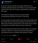 — ⚡️⚡️ ОФИЦИАЛЬНО! ???????? Илон Маск построит город на Луне "Для тех, кто не в курсе: SpaceX уже переключила внимание на строительство саморазвивающегося города на Луне, поскольку мы потенциально можем реализовать это менее чем за 10 лет, тогда как на Марс потребуется более 20 лет. Миссия SpaceX остается неизменной: распространить сознание и жизнь в том виде, в каком мы ее знаем, к звездам. Полет на Марс возможен только во время сближения планет каждые 26 месяцев (время в пути — шесть месяцев), тогда как запуски на Луну можно осуществлять каждые 10 дней (время в пути — 2 дня). Это означает, что мы можем проводить циклы строительства лунного города гораздо быстрее, чем марсианского. При этом SpaceX также будет стремиться построить город на Марсе и приступит к этому примерно через 5–7 лет, но высший приоритет — это обеспечение будущего цивилизации, а с Луной этого можно достичь быстрее." - сказано в заявлении господина Маска в социальности сети X