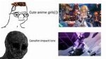 В Геншине никогда не будет этих щечек и лампового свидания с ними. И не в каком-то рофло режиме, а мейн сюжетке. Особенно все это на контрасте, что она массовая убийца, штабелями закатывающая в землю "недостойных жить" в своем баттл сьюте, пока в Г каждый персонаж - беззубый Дисней.