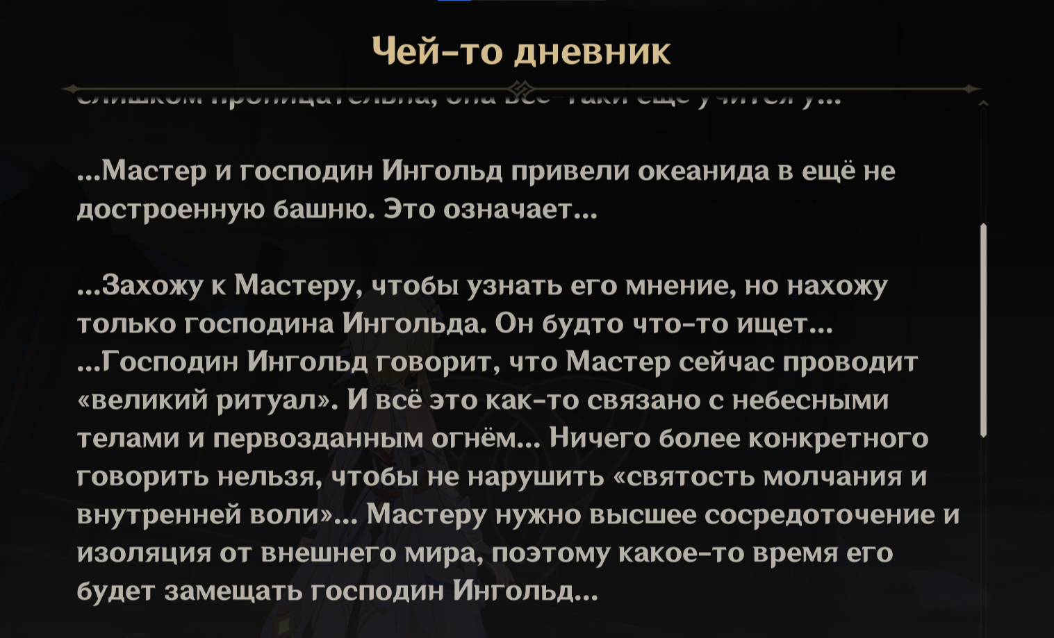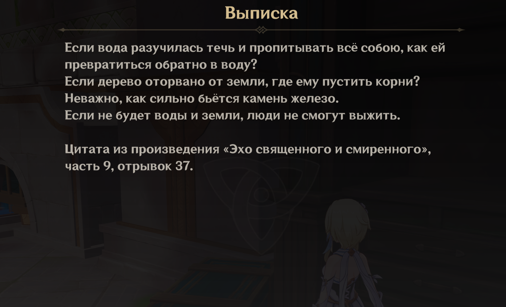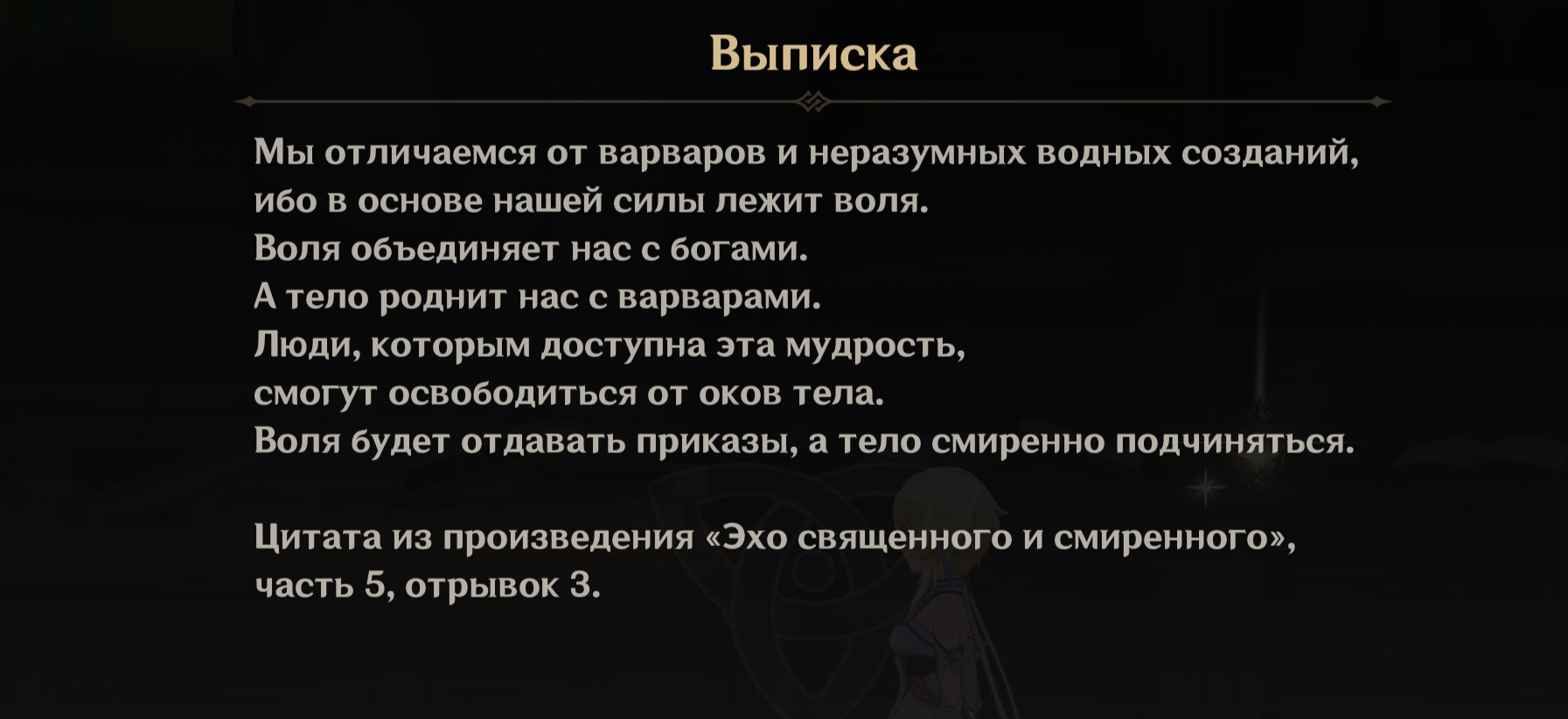 > Иногда я говорю себе, что этот огонь никогда не угаснет. Но это я разжигаю его. Не Небесный порядок. Не Архонты. Я всегда помню о нем. О тепле, о жаре. Он всегда будет частью меня. Но не сегодня.