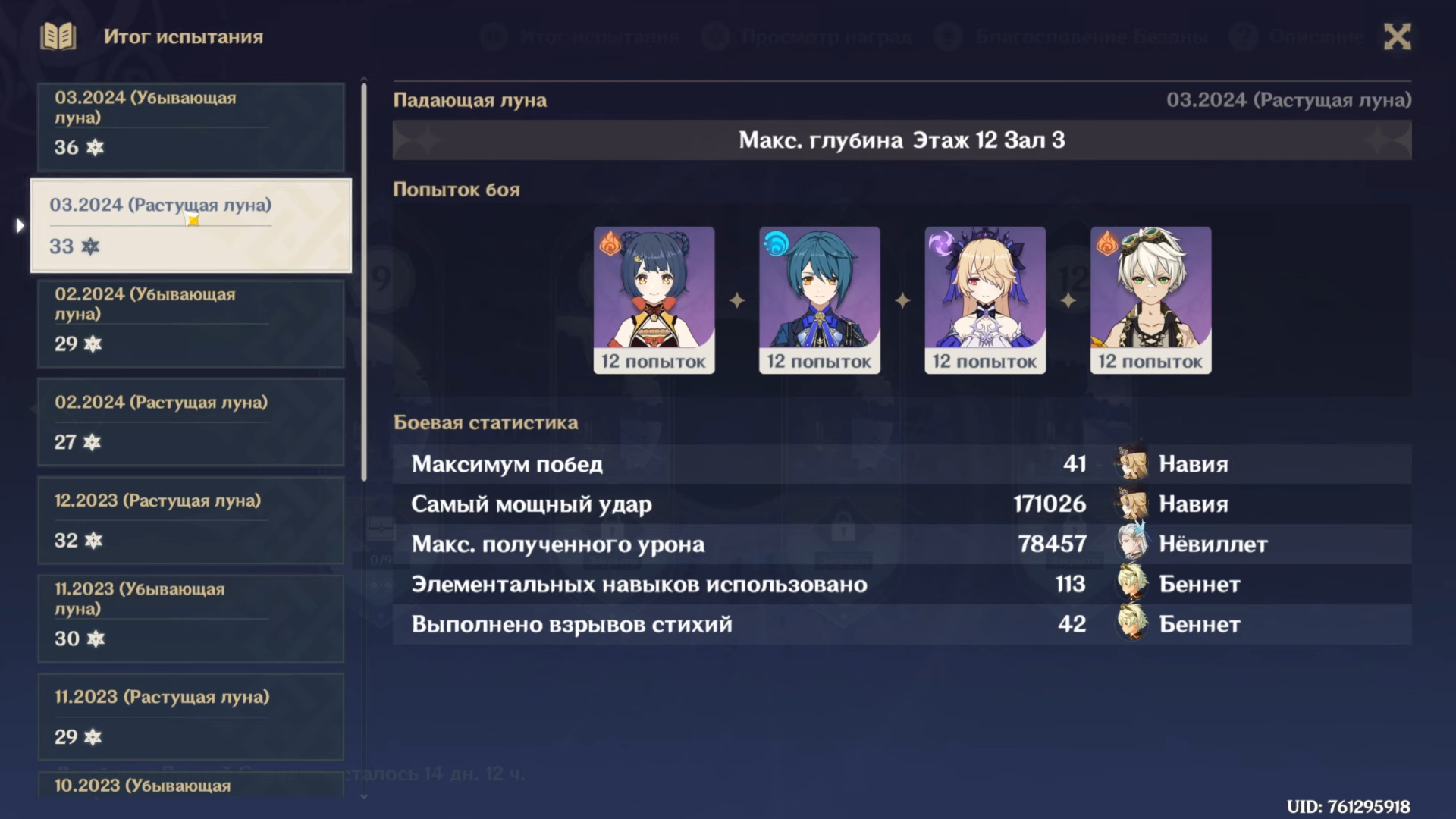 >>2272949 Жизунька. Раньше тоже не мог закрыть 36, год+ закрывал бездну на 33. А как рольнул осенью базвиллета, стал стабильно на 36 каждую дырку закрывать.