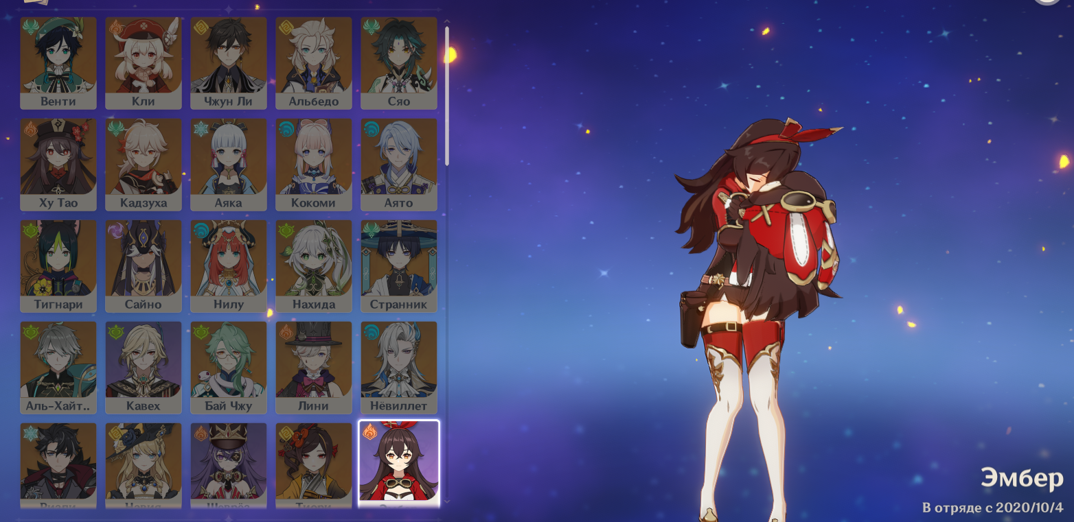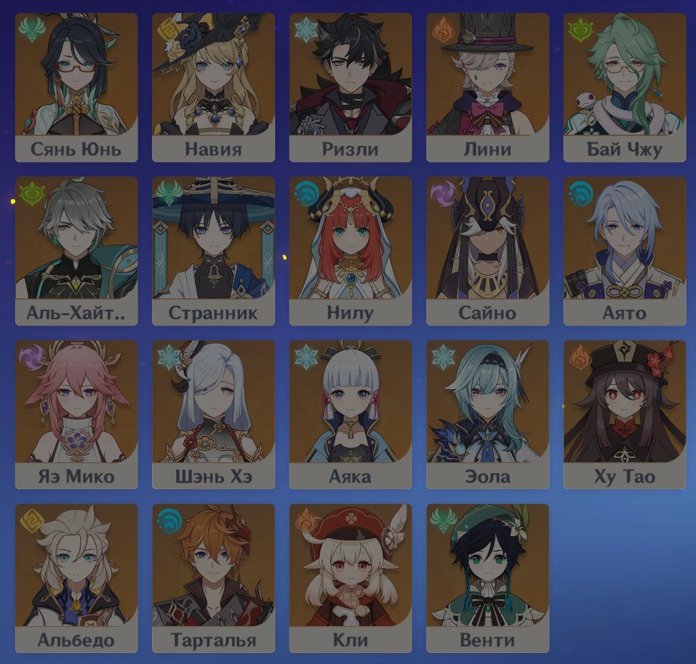 А у меня прям много чаров нету, я играю не постоянно, а волнами, когда в очередном регионе уже что-то выходит помимо х.0 патча. Из всех недостающих в своё время хотел Ху Тао, когда у неё самый первый баннер был, потому что у меня тогда мейн дамагером была Сян Лин. А сейчас у меня мейн пачка Монас1-Эолас2-Райденс1-Джиннс2 и я ею вполне доволен. Хотя было бы интересно куда-то использовать Нахиду, Фурину, Дэхью, ЦиЦи и Гань Юй, но для них ещё фармить артефакты и прочее, а мне нихуя не падает, до сих пор ни одного идеального артефакта ни для кого не упало.