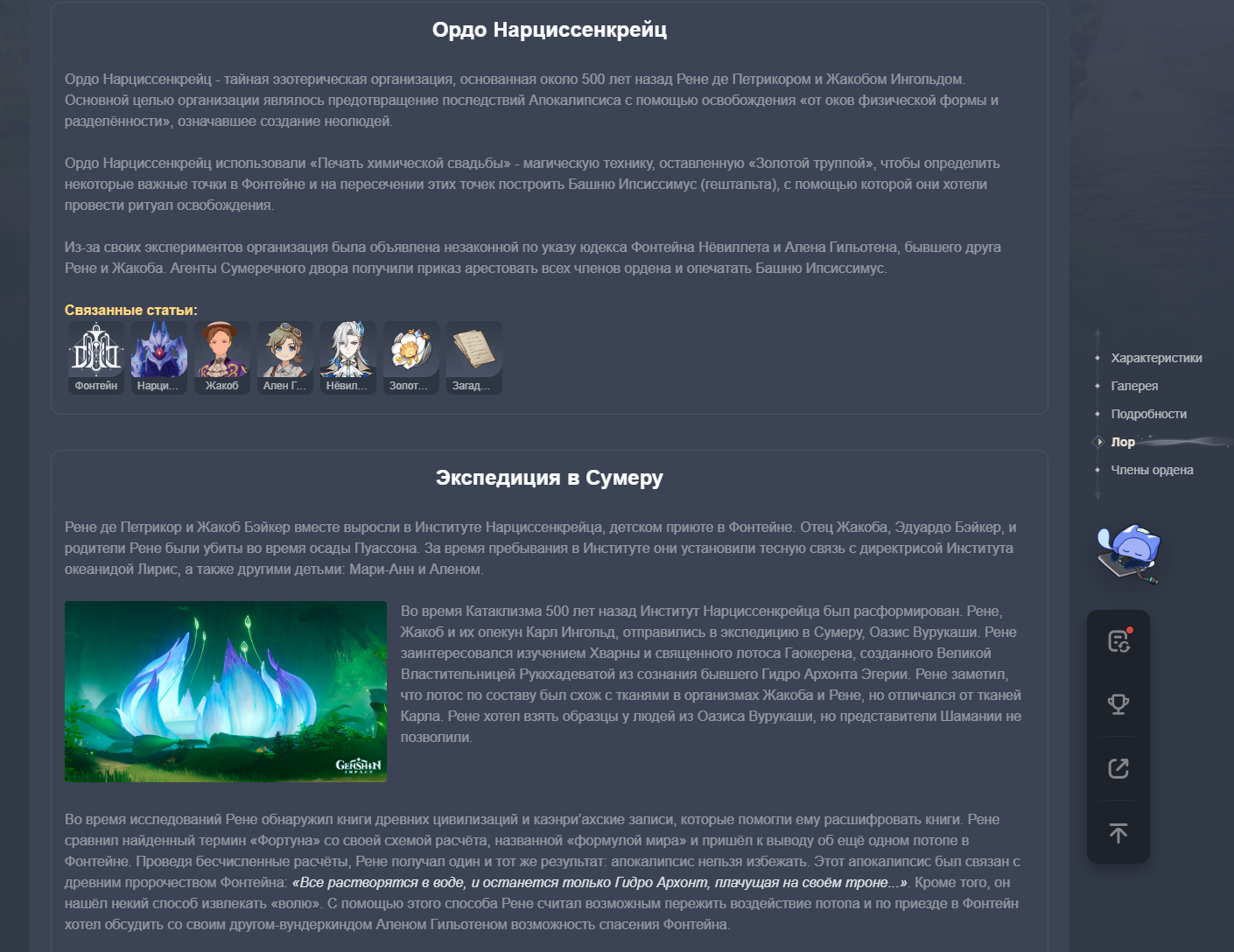 ✦ Базы данных по игре https://gi.hakush.in ∙ https://genshin.honeyhunterworld.com/ ∙ https://homdgcat.wiki ∙ https://ambr.top/