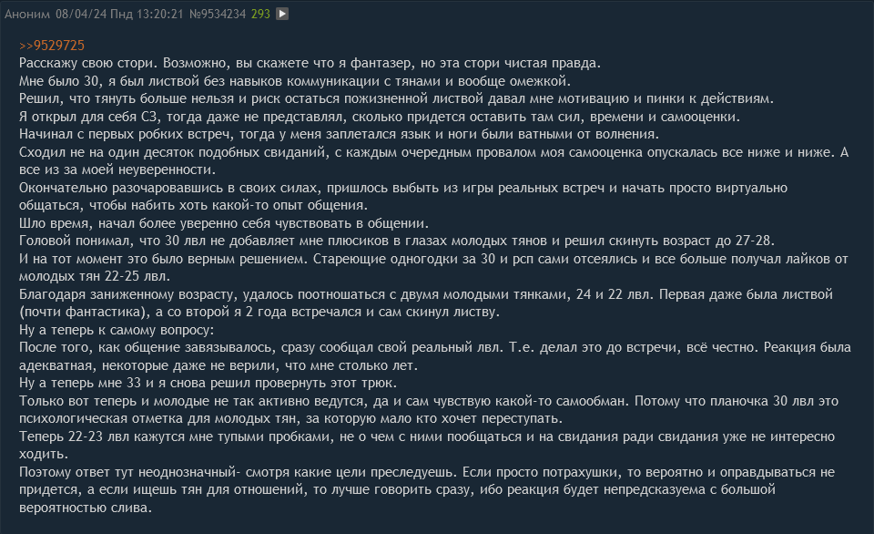 До 2024 можно сказать и не пытался во взаимодействие для няшканий, с начала года было 3 тни, с ними в теории что-то могло получится, 2 тни изначально прямо говорили что мб дадут секс отказали, работка без выходных месяц, сыч гуляй, вторая переобулась, третья говорила что люблю походу как друга, ну я во френдзоне теперь, зато есть с кем пообщатся кроме борд, ведь 0 друзей было, она мне нравится.