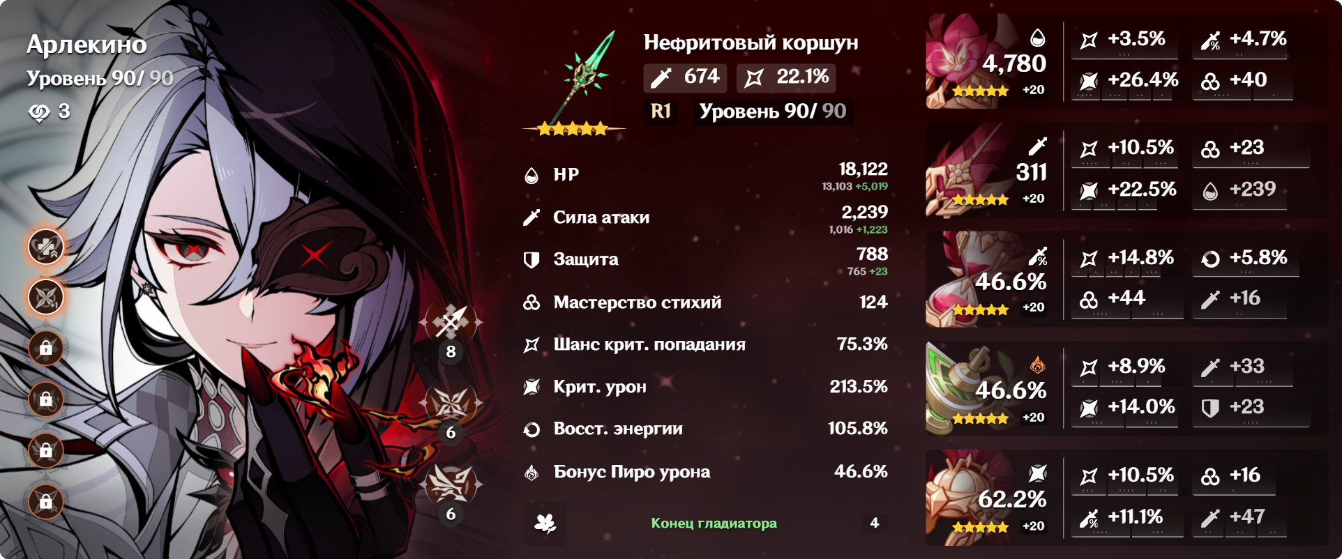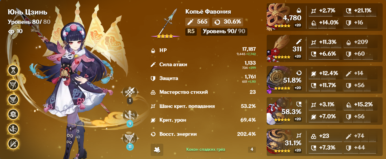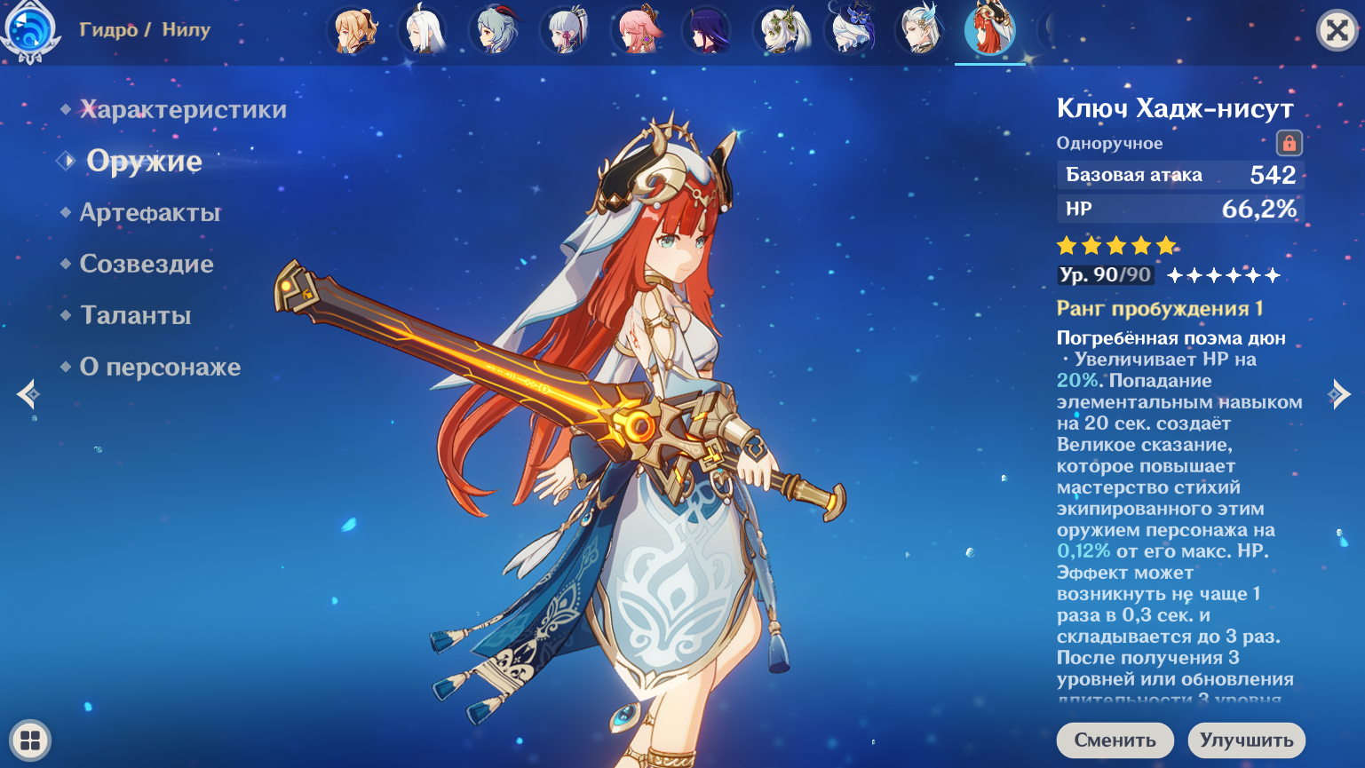 Как играть - все, кто накладывает дендро/гидро, должны быть одеты в ЕМ. Максимум ЕМ баффов выжимай. Сама Нилу у тебя с пушкой - потому ее в максимум ХП собирай, но не выше 75 000.