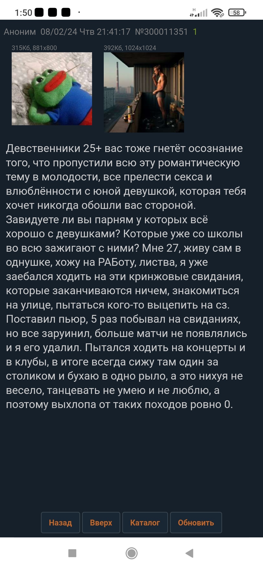 Так что нет смысла здесь что-то писать, когда хочешь поныть. Это ещё не самое дно, у нас тут прям рай. И если уж так сложится что всю свою жизнь я буду жалко существовать нищий одинокий всратый это уже успех. И то что я трачу свою молодость чтобы работать на копейке лишь моя вина, нужно урвать от жизни всё любой ценой идти на риски как можно быстрее получить всё и сразу, и потом посмеяться над теми кто жалкие слабые А ты их специально уничтожаешь и делаешь им жизнь ещё хуже потому что ты имеешь на это силу