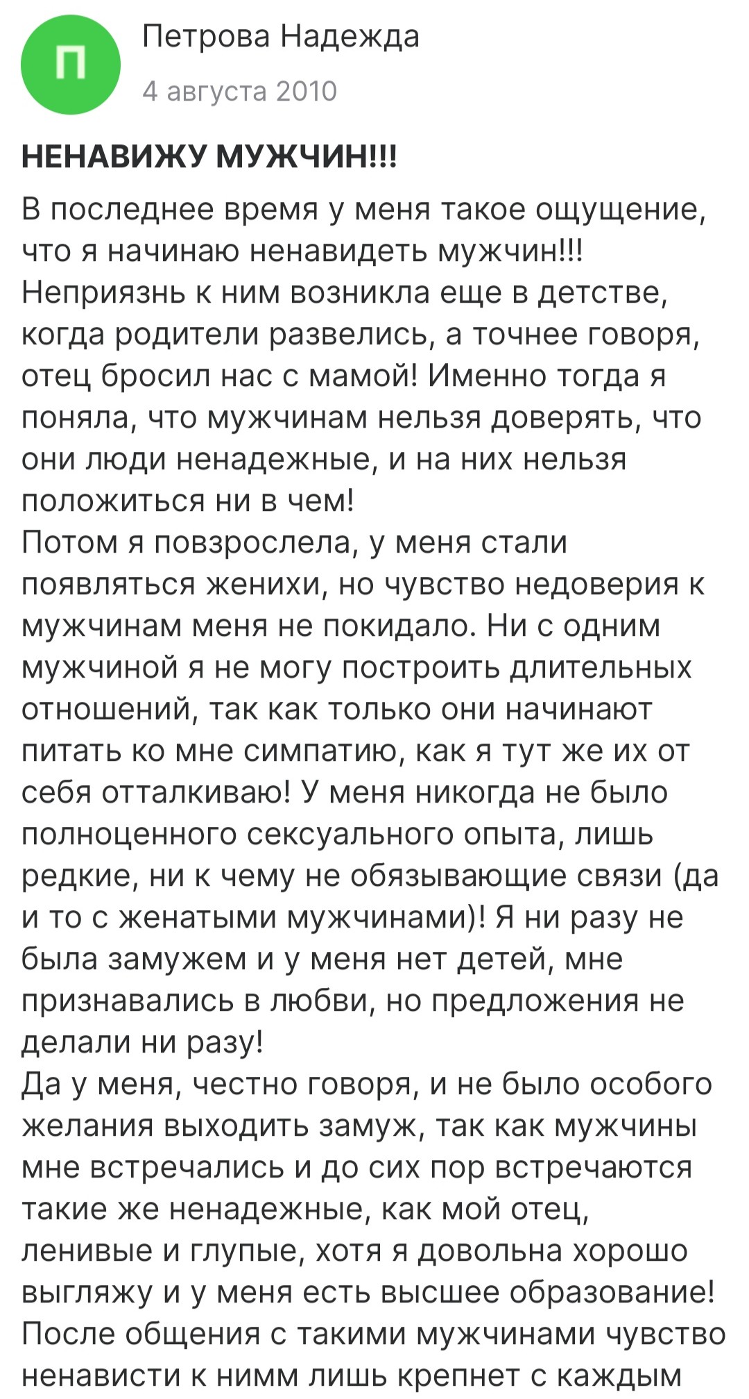 Вот мне интересно, вот это чуханы называют "любовью"? Кайф от унижения женщины они описывают как чувство любви к ней. То есть, женщина, которую мужчина "любит" - это женщина, удобная для слива его гнева. Его игрушка, которую ему нравится терзать.