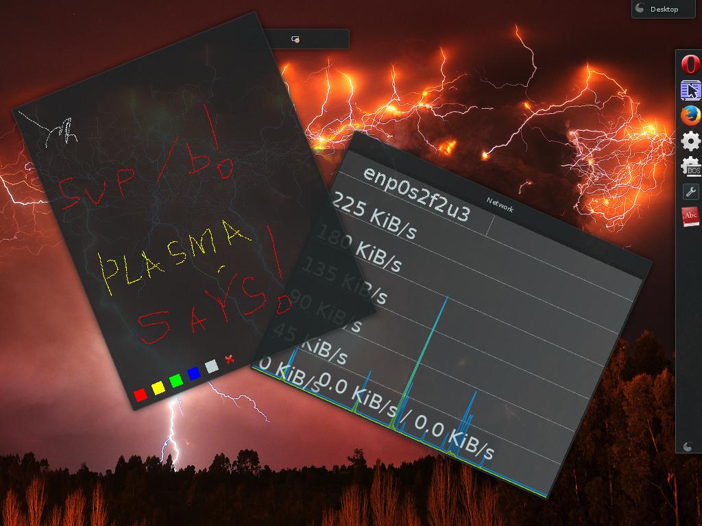То есть панель одну панель можно превратить в "выкидную папку, размером с пол рабочего стола, другую в тонкую полоску значков быстрого запуска. А третью в панель приборов, забитую контролирующими виджетами и стикерами для заметок. Что-то сделать выкидным, что-то постоянно видимым. Я здесь конечно бардака накидал, просто чтобы принципиально показать. По ценру экрана кстати видим значки, вытянутые мышью из трея. Которые тоже можно размещать произвольно, хоть в трее, хоть на десктопе, хоть на лбу у себя, по скольку они тоже реализованы как плазмоиды.
