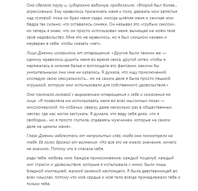 >Она принимает это как чемпионка, как и подобает этой сексуальной маленькой шлюшке Я не знаю что за странные существа придумали такой кринж. Ведь ии брал эти фразы откуда-то. Даже для порно фанфиков это выглядит нелепо.