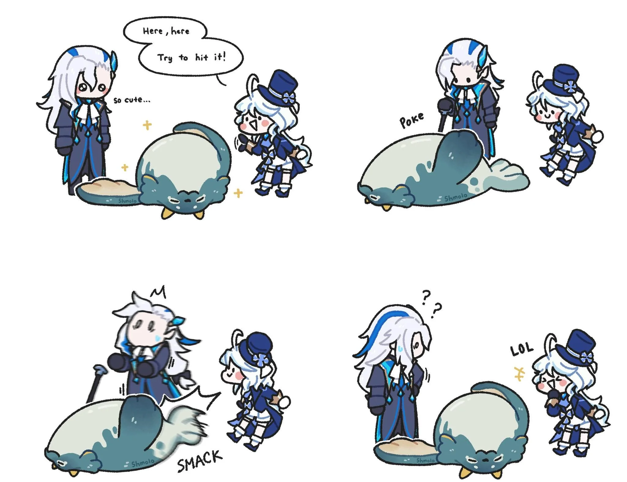 Хитрая кохумка (известна как тролька) разыграла Нёвиллета предложив ему тыкнуть в пухленя, но пухлень оказался жосеньким и дал Нёвиллету лещанского. Вот это хитрый план, достойный большого ахогэ.