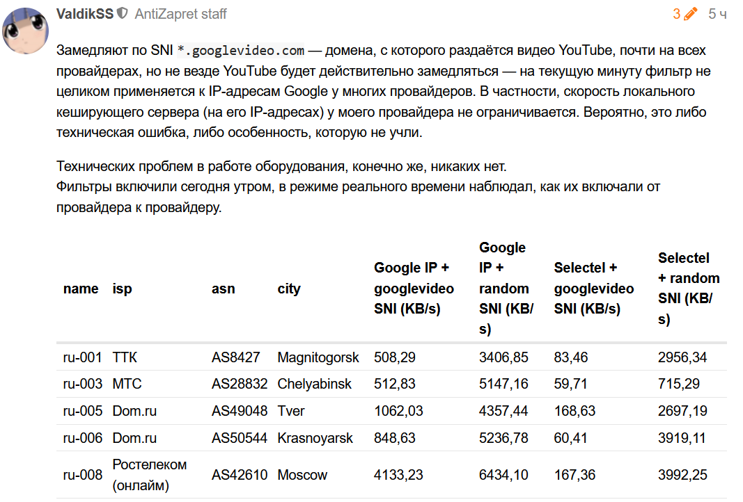 > «Оборудование не может деградировать в одну минуту, оно деградирует постепенно. В данном случае имеет место троттлинг, его раскатывают на оборудовании ТСПУ у разных провайдеров. Мы видим замедление, и оно нарастает: утром было у некоторых провайдеров, потом уже появилось почти у всех. Видимо, YouTube решено не блокировать, а замедлять, чтобы им было сложнее пользоваться».
