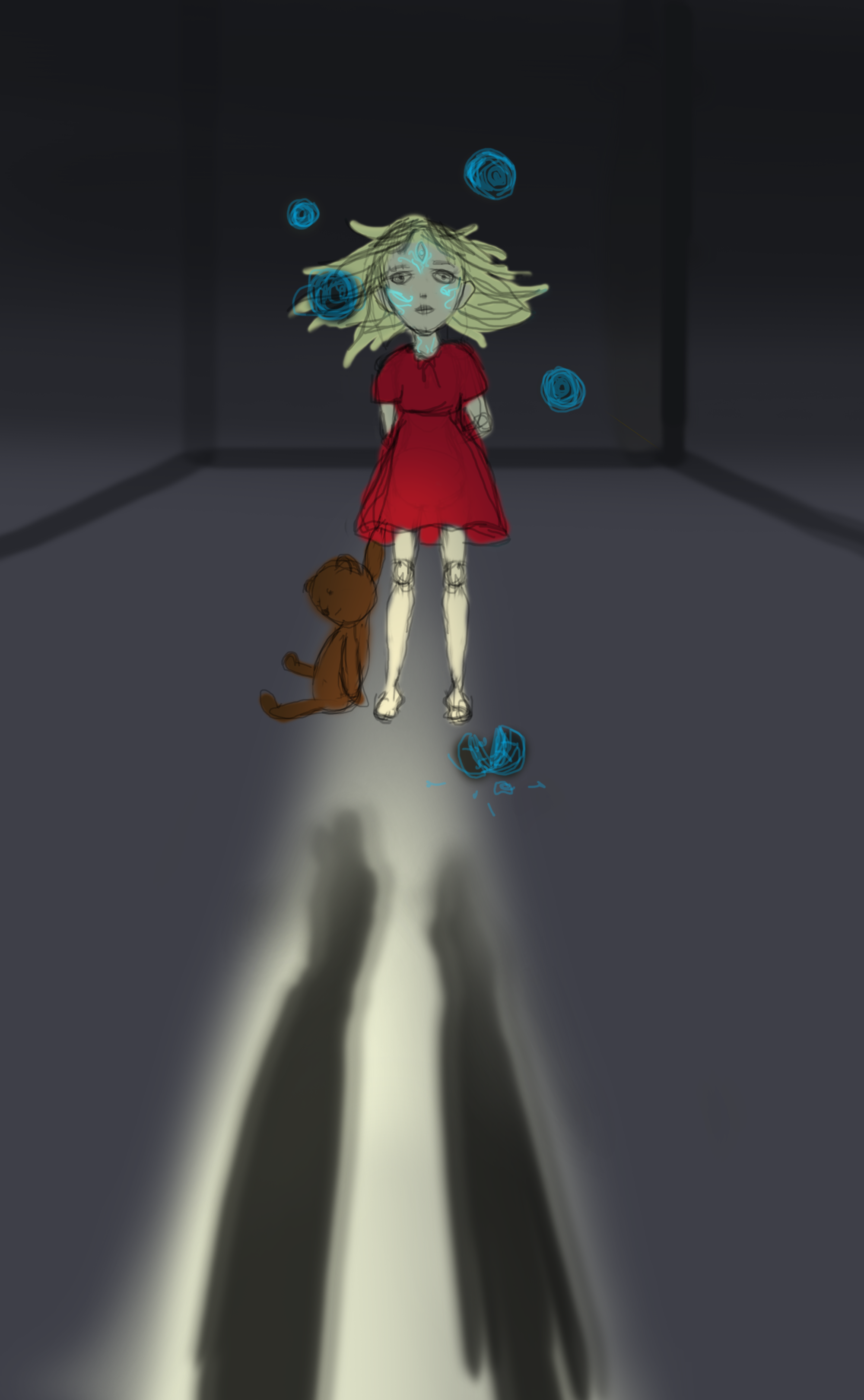 >Стоит девочка или мальчик в комнате,держит мишку в одной руке, ну и третий глаз на лбу. И четыре шара как бы крутятся над головой(телекинез) На ребенка падает свет с открытой двери. А в отражении света на полу видно тень нескольких людей.