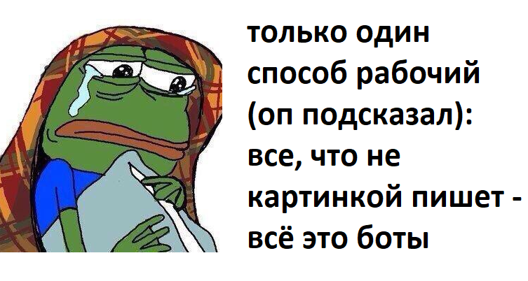 Вы просто представьте уровень сюрриализма. В треде на дваче, боты с обеих сторон триггерятся на ключевые слова в постах друг друга и единственные, кто общаются в этом треде на полит темы текстом. Кроме одного тролля, тут еще никто пикчей не отписывался насчет политики