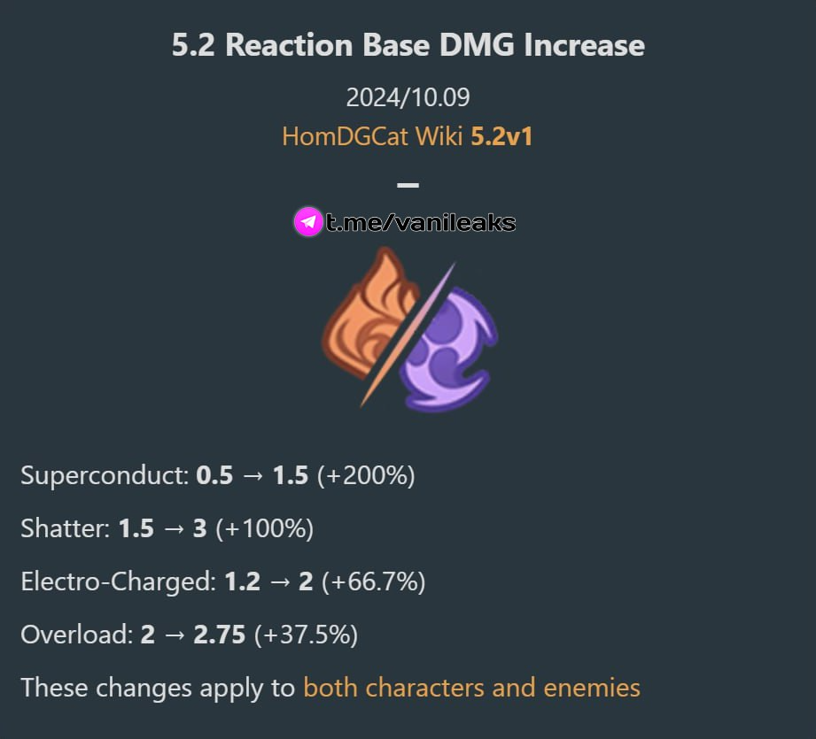 • 🟣 • Эти изменения применяются к персонажам и противникам. На второй картинке показано сравнение урона от реакций до обновления 5.2 и после обновления 5.2.