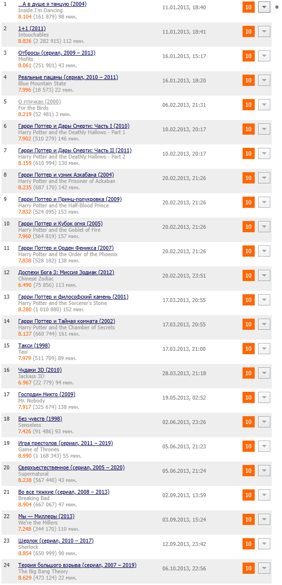 У меня сложилось стойкое чувство, что люди за всю жизнь посмотрели фильмов 10-15, причём большинство из них лет в 16 по телевизору и просто решили для себя, что это теперь их любимые фильмы и на этом хватит, настолько много кинца, которое хоть сколько-то искушённый зритель никогда бы не оценил выше, чем 6-7 из 10 (если бы вообще досмотрел), и просто забыл о их существовании.