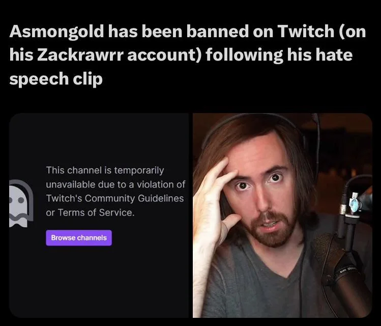 >>311732675 (OP) Звезда стриминга Asmongold, настоящее имя которого Зак Хойт, заблокировал один из своих аккаунтов на Twitch после неоднозначных комментариев, сделанных на платформе. В течение последнего дня Хойт сделал ряд заявлений, касающихся продолжающегося конфликта между Израилем и Палестиной. В частности, во время стрима Хойт сказал, что палестинцы - "ужасные люди", которые "происходят из низшей культуры, которая ужасна". В связи с этими высказываниями многие призвали запретить Хойту доступ к Twitch за нарушение Условий предоставления услуг сайта, с чем Twitch теперь однозначно согласился.