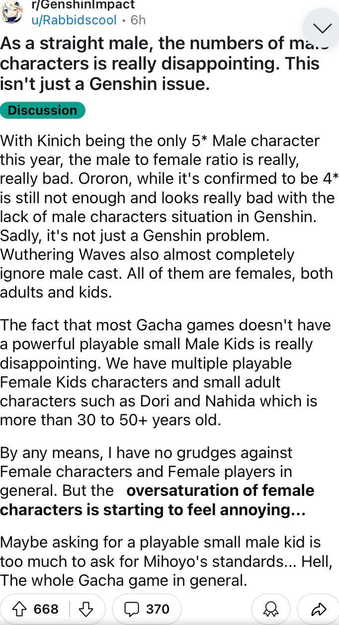 >>3598315 Странно что у меня года полтора назад такой шизы вообще не было, наверное и у большинства в треде тоже, спокойно крутил и играл мужскими персонажами. Да я даже невиллета выкрутил, а сейчас даже бесплатно бы не взял