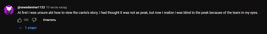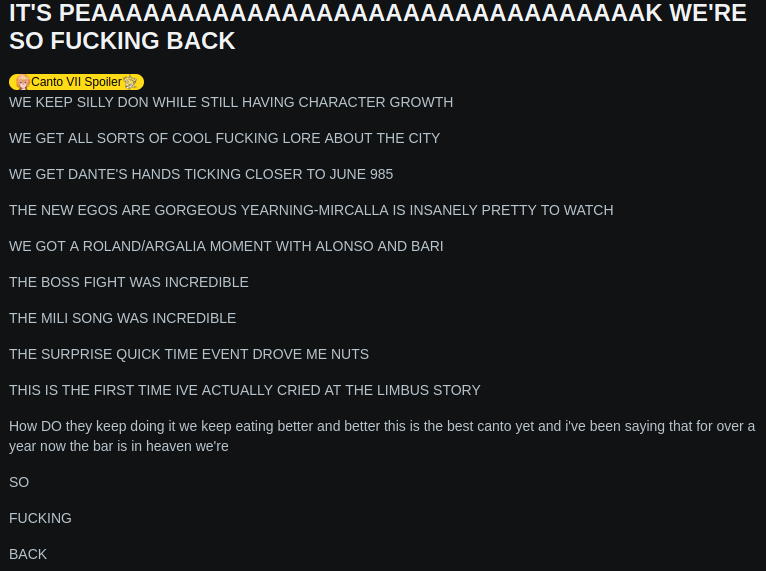 Не подскажите, а нахуя Джихуй сам скринжевывает собственные диалоги? Вот в концовке второй части 7 главы ему обязательно было добавить выебон от Отис про Лету, с лицом типа далеко не все поймут, мало сейчас образованных лимбусят? Обязательно было убивать саспенс и ссать на персонажа Данте нытьем про то, какая же саян форма Санчухи жееесть страшная, да как же никто нипрастит низабудит что он бедный ВРАЛ всем? Будто бы кому-то из остальных грешников реально не похуй на неё было. Хороший же момент был, но нет, надо ведь испортить впечатление.