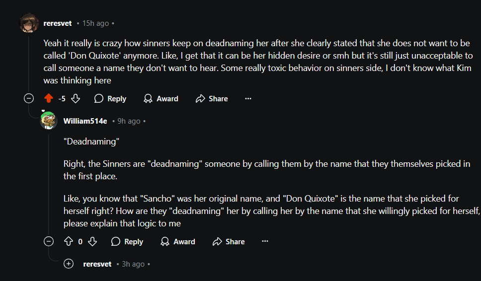 Падажжите, а про кого Донка в итоге говорила, что один её друг пиздил её до беспамятства когда она слишком зарывалась? Про Лунного Рыцаря? Или Санчо на самом деле издил её собственный батя, и вся история канто 7 - это очередная итерация вечной джихуйской истории про абьюзивных родителей? На среддите вон Дона который Алонсо, судя по всему это его настоящее имя уже давно записали в некапитанокораблевых газлайтогарпунеров и чуть ли в изнасиловании не обвиняют, если щас еще ветка про побои вскроется, то его вообще похоронят. Бабам все таки можно арбузить баб по вестоидским понятиям, а вот мужика за ББПЕ и закэнселить могут.