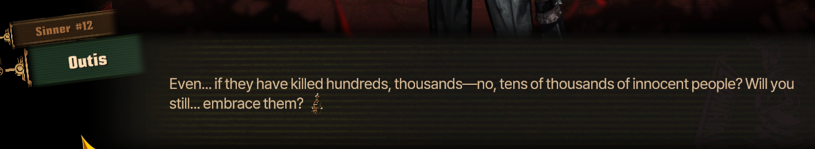 Персонажи в игре имеют интересные и уникальные предыстории, однако их внутренние конфликты зачастую оказываются менее важными, чем просто наличие "грехов". Несмотря на то, что они называются "грешниками" и их прошлое должно играть ключевую роль, игра не всегда раскрывает глубину их мотиваций или искупления. Грехи героев кажутся скорее символами, чем реальными травмами или ошибками, которые нужно проработать. Это ведет к тому, что их путешествие становится менее интересным и эмоционально вовлечённым, особенно по сравнению с более глубоко проработанными персонажами в других играх Project Moon.