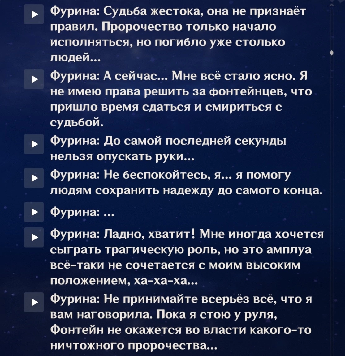 Я тут понял что история фурины это хуйня так-то. Ну типа она страдала даже не столько от того, что не знала как спасти народ, ибо она не фокалорс в смысле личности полной, сколько от того (что и типа нагнеталось), что ей некому высказаться. То есть чисто ирлная нормисная трагедия бабы, которой нужно хранить секрет, а пиздеть они очень любят, и нужно найти решение самой, не перекладывая ответственность на других (по-мужски). Не, она конечно справилась и даже на мерзотную хуйню подставу не прогнулась и сделала как надо, за это ей респект и уважуха, но все-равно какая-то хуйня, смотри спектакли, кушай тортики, вжушкай с гоев на суде, у нее негатив-то был за 500 лет спукибатя только, помимо стетаний что делать. Короче хз, я ее люблю, но осадочек остался. Мб я просто это подметил и меня тригернуло на ирл селедок.