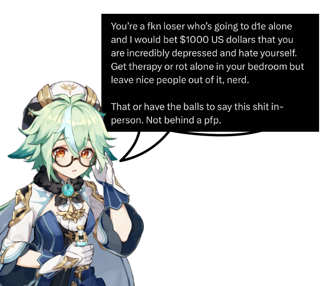 >>3845203 Я бы наоборот скорее её попросил мне золотой дождик подарить >>3845127 Чего начальство фатуи вечно хочет добиться, я всеравно законченый биомусор для общества, фатуйшу я не найду, семью не создам, как солдат я слаб и бесполезен, от того что мне запретят акашу с пропагандой селестии я уже не стану отбитым юбер фатуе-ботом который будет за царицу до последнего. Суверенной акашей из меня не сделать полноценной ячейкой фатуе-общества, я скорее иссекай в тейват к нахиде сделаю от такого, неиронично может произойти со мной что то страшное, если мне запретят доступ во всемирную акашу, потому что я очень зависим от буров например, где люблю посмотреть прон с любимыми девочками, и я уже тупо не смогу жить без этого, и фатуи просто потеряет меня с концом, но никак не исправит, меня фиксанет только могила.