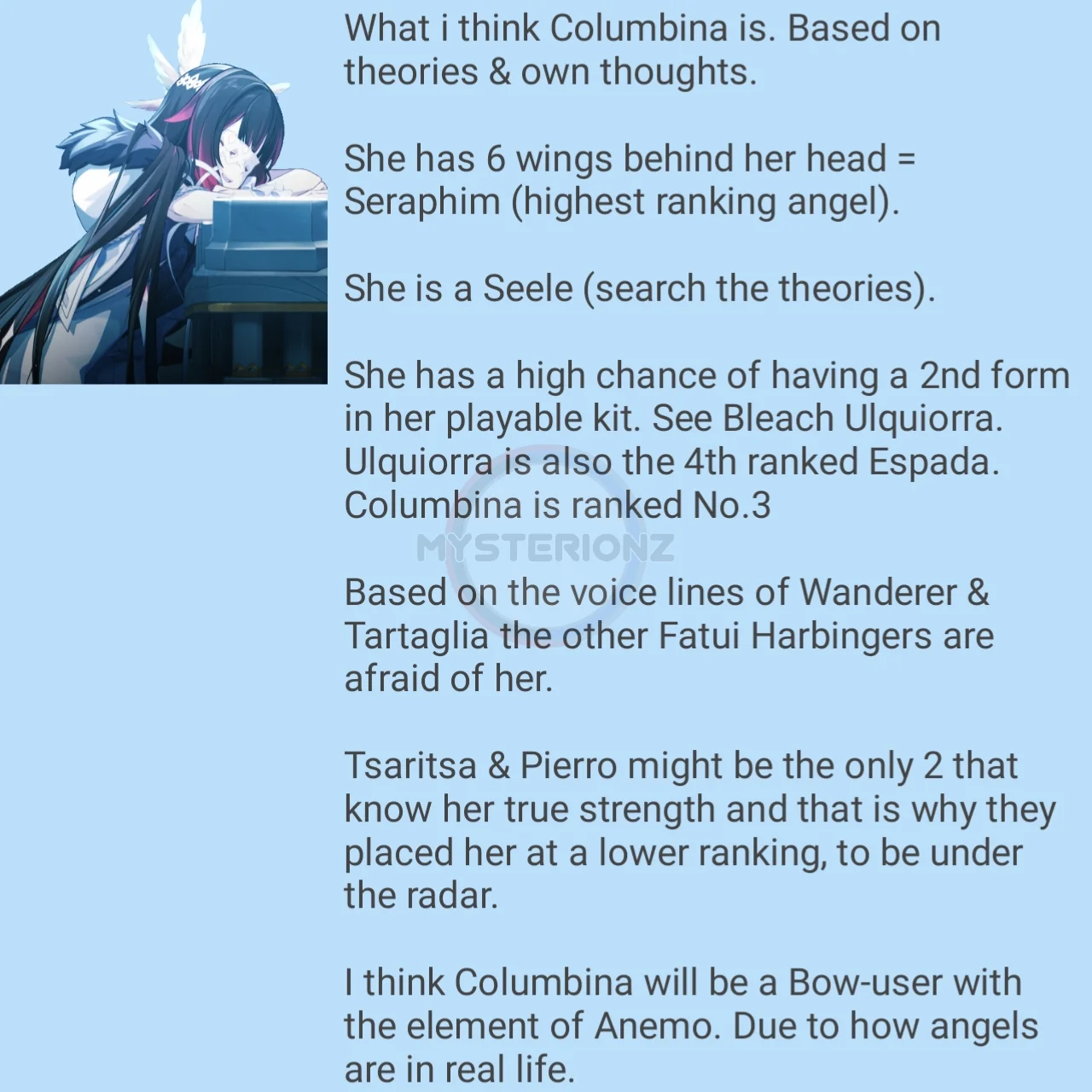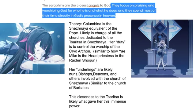 По каким-то сливам было, что у Колумбины есть особое зрение, позволяющее видеть истину и распознавать ложь. Это значит, что вам не получится обмануть её и назвать себя вайфуэнджоером, если на вашем аккаунте обнаружится С3Р1 Нёвиллет или Альхайтам.