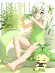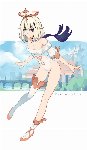 Paimon has a petite body, giving her the look of a fairy. She has thick white hair cropped just above her shoulders, dark purple eyes, and light skin. In some official art, the tip of one of her front hair locks fades to black.