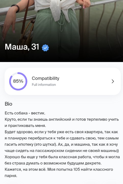 Меня удивляет феномен ненависти к бабам с животными. Ты же не жену себе ищешь сразу с обязательной перспективой совместного проживания, при котором псина будет доставлять тебе дискомфорт. Причём, если у бабы указано "только серьёзные отношения, ебля ради ебли мимо" то это так же вызовет бугурт. Но псина блять может осложнить тебе жизнь ТОЛЬКО при серьёзных отношениях и совместном проживании. Шизофреники.