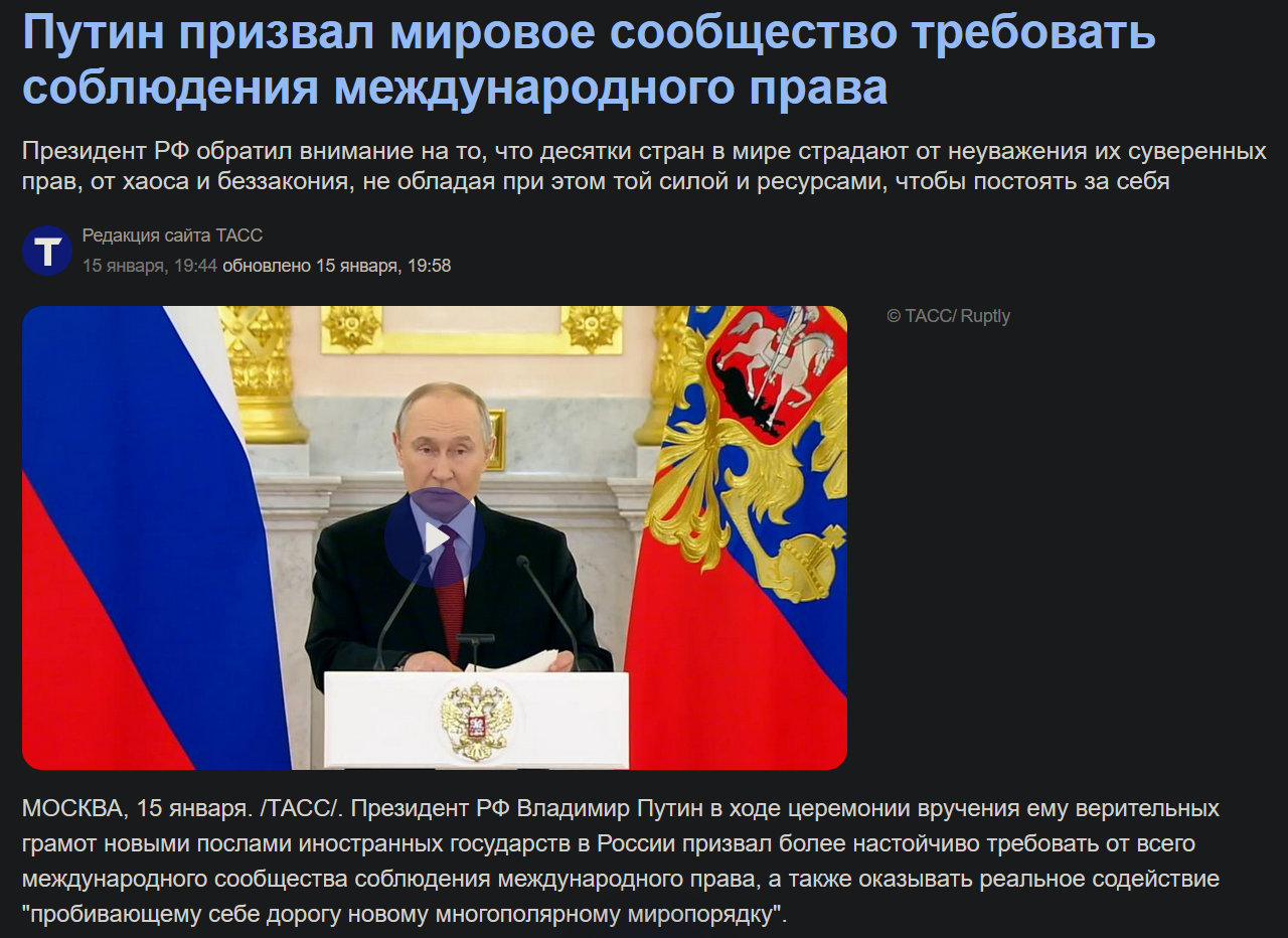 1. Это ПРОВОКАЦИЯ. Очень хорошо что руководство РФ не поддаётся на провокации. 2. Венесуэльской спецоперацией США сделали только хуже сами себе. Похитив Мадуро, США тем самым настроило против себя всю южную америку. 3. Те кто сравнивает похищение Мадуро и эффективность десанта на Гостомель - не патриот! 4. Танкеры, которые захватили американцы, не наши. Мол и российского флага там не было и члены экипажа грузинокаклы итд. Ну какой-то там теневой флот плавает, но РФ тут не при чём. 5. Ну и лахтостандарт по мелочи ввиде: Европа во-вот замёрзнет, турбулентность, какие-то расплывчатые фразы про баланс сил (в котором РФ конечно стронг!)
