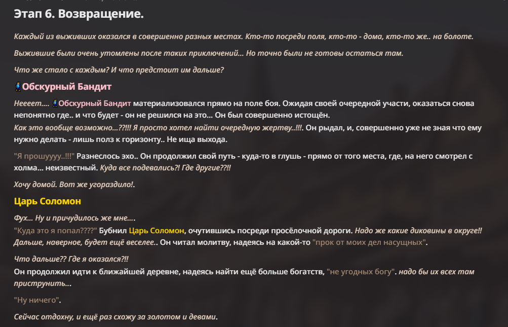 Правила (могут меняться в зависимости от ОПа): 1. Максимум в бою могут участвовать 12 персонажей. После этого набор закрывается и начинается битва. 2. Нельзя предлагать персонажей на около божественном уровне силы. Галактикошататели, одной рукой уничтожающие вселенные, демиурги, творцы и архангелы - это божественный уровень силы. Неуязвимость от всего + бессмертие - это божественный уровень силы. 3. Персонажи с напарниками НЕ запрещены В РАЗУМНЫХ ПРЕДЕЛАХ, с соблюдением баланса сил. Никаких легионов космодесанта. Уточняйте у текущего ОПа. 4. После участия в бою персонаж уходит на перерыв в 3 боя (сделано для защиты от спамеров одного персонажа). 5. Нельзя предлагать персонажей которые могут призывать других существ без каких-либо условий. Пример: Маг который призывает демонов по щелчку пальцев == не допускается. Маг которому нужны трупы или какой-то длительный ритуал с условиями для призыва демона == допускается. 6. После использования локации она выбивается из случайного списка на 9 боёв (Почему так много? Ради разнообразия). >Upd. Формат может меняться в зависимости от ОПа 7. Набор персонажей полностью закрывается после начала боя и открывается только когда он закончится и будет объявлен новый набор. Если персонаж вкинут до набора - не обижайтесь, что его не приняли. 8. Ведущий оставляет за собой право не принять вашего персонажа. Будьте корректны - в случае, если такое произошло, вежливо спросите причину и/или дождитесь другого ведущего. 9. Неуничтожимые волшебные артефакты, дающие владельцу абсолютную неуязвимость от любых навыков/действий - запрещены. Аргумент, что "его можно перевернуть" - не принимается. Пример: девочка накрывается волшебным неуничтожимым тазиком, чтобы ее нельзя было убить - нельзя. 10. Ведущий, очевидно, вправе трактовать любое правило в свою пользу.
