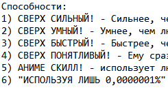 Способности: краткое описание пассивных способностей и особенностей. (например: "Персонаж говорит только на немецком")