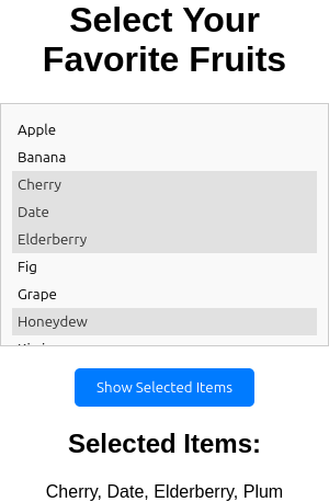 A button triggers a JavaScript function that retrieves and displays the selected items.
