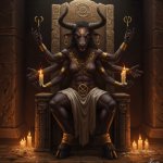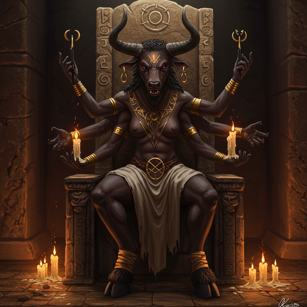 >Minotaur black women as an ancient Sumer goddess, with four hands, masculine, primal, brutal, sits on the ancient stone throne, fire and candles, ancient prehistoric temple, occult symbols in her hands