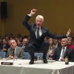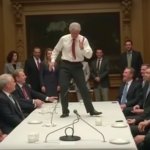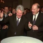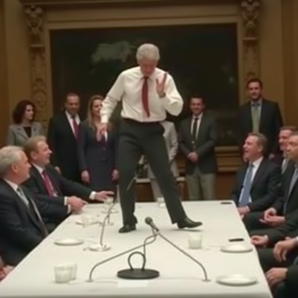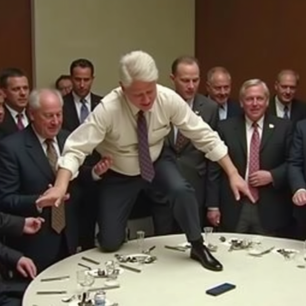 >>316331818 very drunk messed up Bill Clinton dancing on table at United Nations cnn news video, white table, neutral colors, untied tie, chaos, people laughing